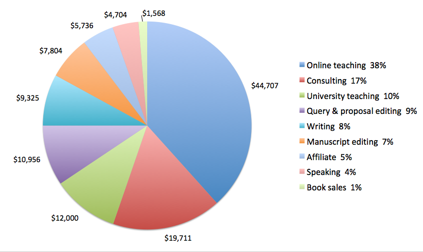 Today, the lion’s share of my income comes from helping writers with their submissions materials and business consulting with individuals, businesses, and organizations. Online teaching is next, followed by writing. In 2018, it’s possible that writing work will become my second biggest revenue generator, partly due to the success of my email subscription newsletter, The Hot Sheet. Speaking is my smallest earnings category, which I hope to change by increasing my speaking fees. I stopped taking manuscript editing work and I stopped adjuncting at the University of Virginia.