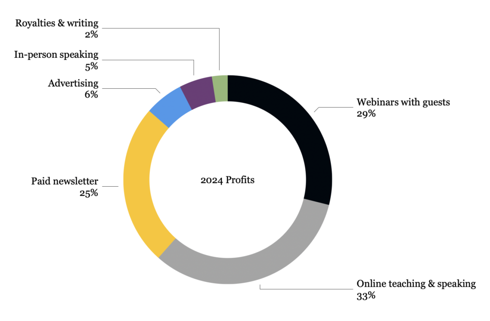 - Paid newsletter (25%): Once known as The Hot Sheet, this is now called The Bottom Line. Profits in 2024 were $112,000; top-line revenue was close to $150,000. I launched free edition of The Bottom Line in 2025, along with a higher-priced supporter tier.